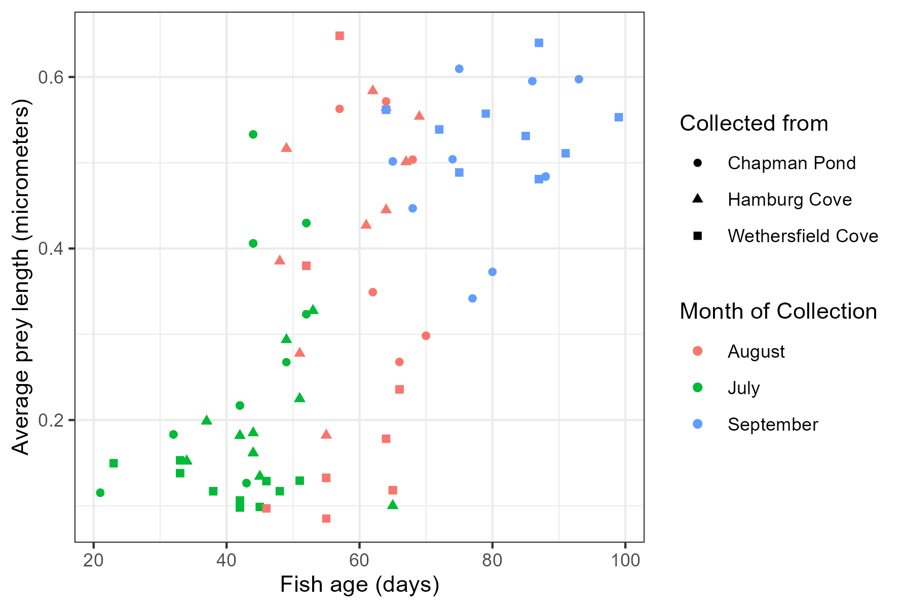 labs(x = "Fish age (days)", y = "Average prey length (micrometers)",