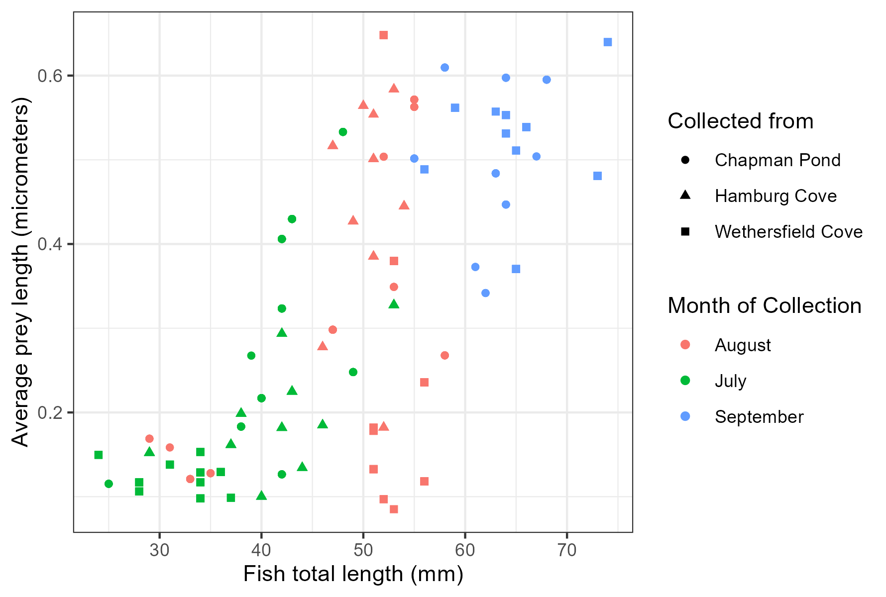 labs(x = "Fish total length (mm)", y = "Average prey length (micrometers)",