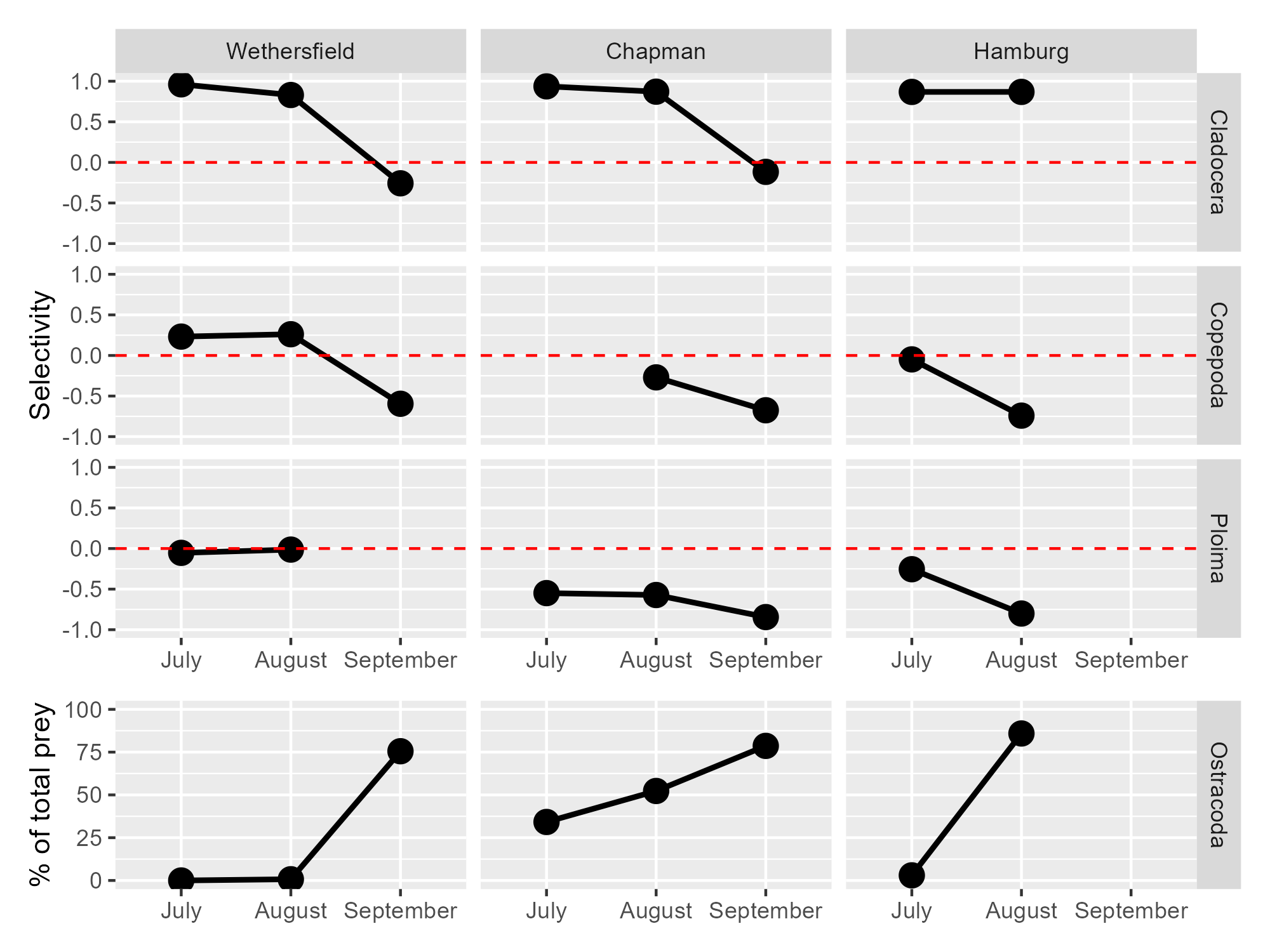 4.2.1 Use ggplot to create a graph of selectivity of different prey categories across months and sites